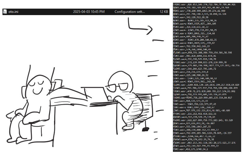 Configuration files, or more officially oto.ini files, split, time, and name audio files for use in UTAU.